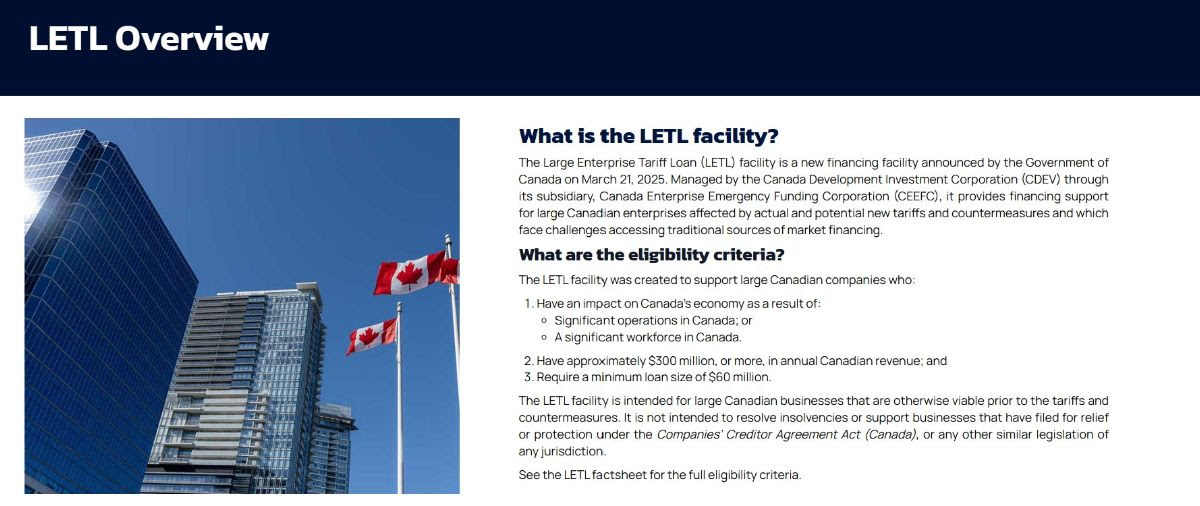 The Large Enterprise Tariff Loan (LETL) facility is a new financing facility announced by the Government of Canada on March 21, 2025. Managed by the Canada Development Investment Corporation (CDEV) through its subsidiary, Canada Enterprise Emergency Funding Corporation (CEEFC), it provides financing support for large Canadian enterprises affected by actual and potential new tariffs and countermeasures and which face challenges accessing traditional sources of market financing.