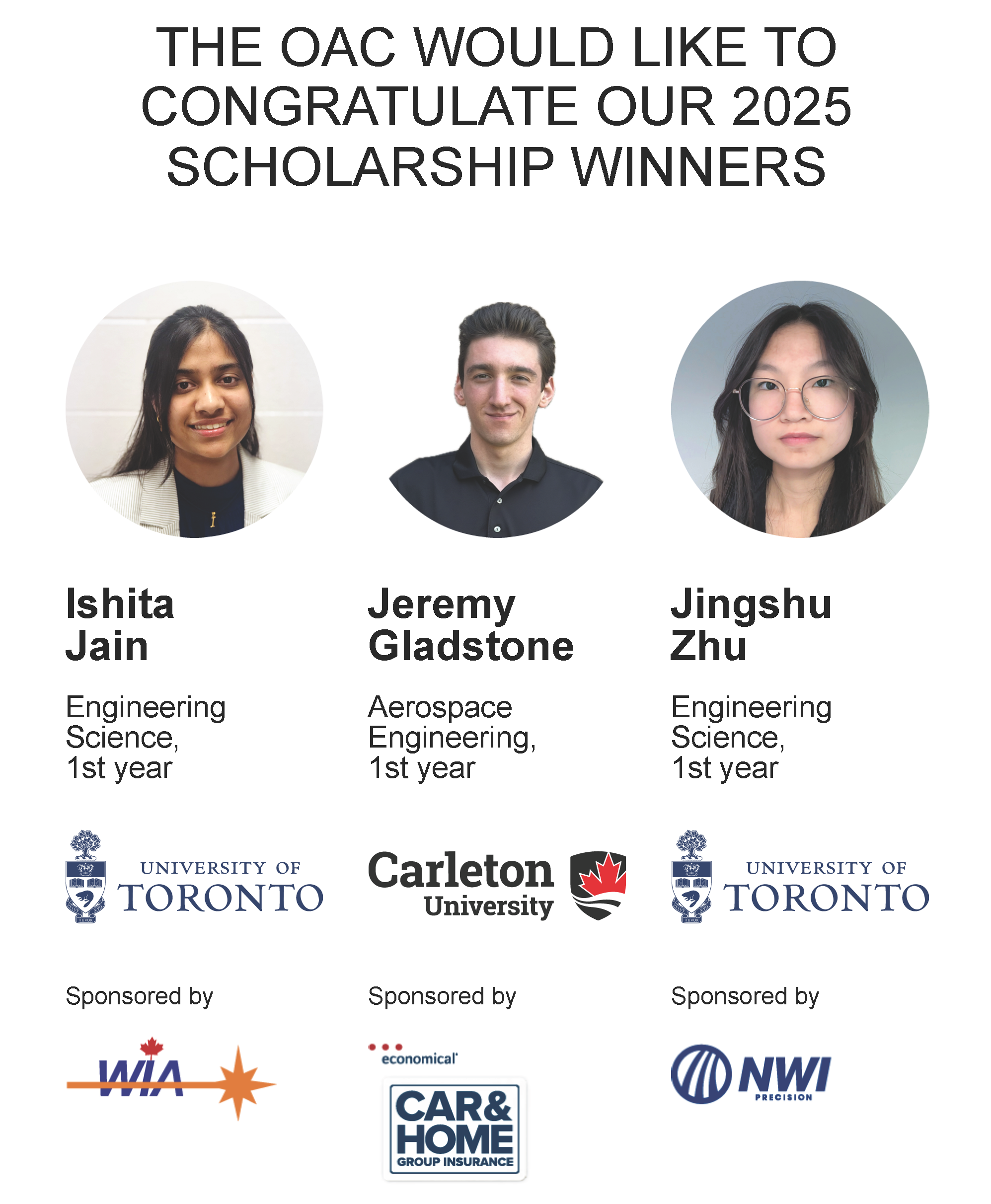 In June 2026, the OAC will be offering SIX scholarships of $2,500 each to deserving students enrolled in Ontario post-secondary institutions for the 2026-2027 academic year. From first year to post-graduate studies, all college & university aerospace programs qualify!